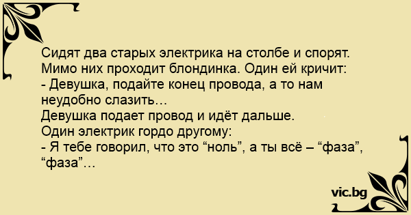 Сидят два старых электрика на столбе и спорят. Мимо них проходит блондинка. Один ей кричит: