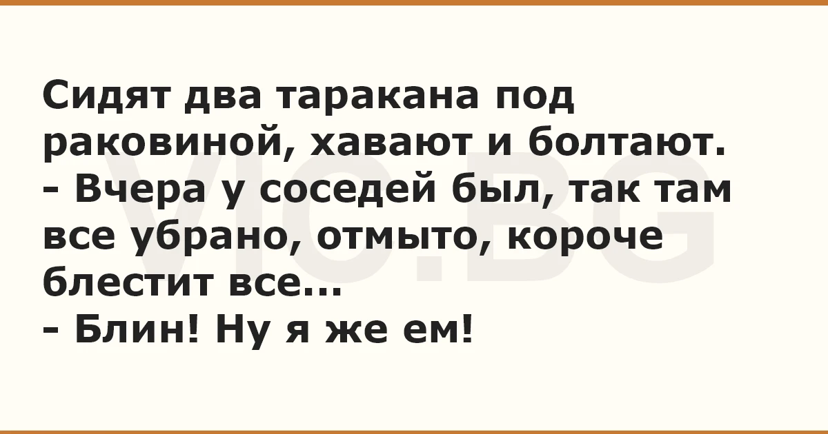 Сидят два таракана под раковиной, хавают и болтают. - Вчера у соседей был, так там все убрано, отмыто, короче блестит все... - Блин! Ну я же ем!