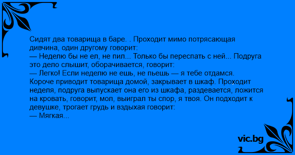 Сидят два товарища в баре. . Проходит мимо потрясающая дивчина, один другому говорит: — Неделю бы не ел, не пил... Только бы переспать с ней... Подруга это дело слышит, оборачивается, говорит: — Легко! Если неделю не ешь, не пьешь — я тебе отдамся. Короче приводит товарища домой, закрывает в шкаф. Проходит неделя, подруга выпускает она его из шкафа, раздевается, ложится на кровать, говорит, мол, выиграл ты спор, я твоя. Он подходит к девушке, трогает грудь и вздыхая говорит: — Мягкая такая... . Как ХЛЕБУШЕК...