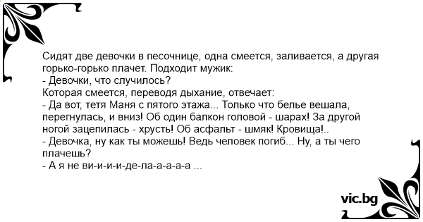 Сидят две девочки в песочнице, одна смеется, заливается, а другая горько-горько плачет. Подходит мужик: