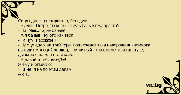 Ну, я оцэ подумав: кухвайка у меня стара, порвана, промасляна... Став я до тpaXтура раком, зробыв он свое грязное дело... А кухвайку так и не купыв. Ну чи не п%дараст?!!