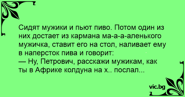 Сидят мужики и пьют пиво. Потом один из них достает из кармана ма-а-а-аленького мужичка, ставит его на стол, наливает ему в наперсток пива и говорит:
