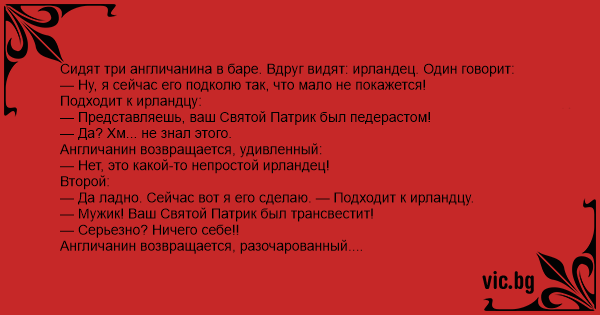 Седят си трима англичани в бара. По едно време виждат 1 ирландец. Единият казва: - Сега ще отида да му разкажа играта! Отива при ирландеца: - Знаеш ли, че вашия Свети Патрик е бил педераст! - Тъй ли? Не знаех... Връща се англичанинът учуден: - Този е...