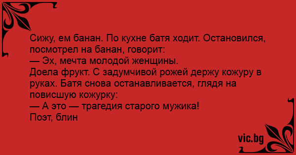 Сижу, ем банан. По кухне батя ходит. Остановился, посмотрел на банан, говорит: