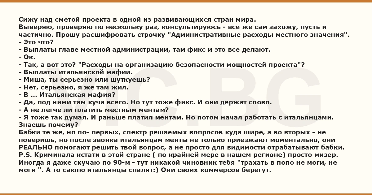 Сижу над сметой проекта в одной из развивающихся стран мира. Выверяю, проверяю по нескольку раз, консультируюсь - все же сам захожу, пусть и частично. Прошу расшифровать строчку "Административные расходы местного значения". - Это что? - Выплаты главе местной администрации, там фикс и это все делают. - Ок. - Так, а вот это? "Расходы на организацию безопасности мощностей проекта"? - Выплаты итальянской мафии. - Миша, ты серьезно или шуткуешь? - Нет, серьезно, я же там жил. - В ... Итальянская мафия? - Да, под ними там куча всего. Но тут тоже фикс. И они держат слово. - А не легче ли платить местным ментам? - Я тоже так думал. И раньше платил ментам. Но потом начал работать с итальянцами. Знаешь почему? Бабки те же, но по- первых, спектр решаемых вопросов куда шире, а во вторых - не поверишь, но после звонка итальянцам менты не только приезжают моментально, они РЕАЛЬНО помогают решить твой вопрос, а не просто для видимости отрабатывают бабки. P.S. Криминала кстати в этой стране ( по крайней мере в нашем регионе) просто мизер. Иногда я даже скучаю по 90-м - тут никакой чиновник тебя "трахать в попо не моги, не моги ". А то саклю итальянцы спалят:) Они своих коммерсов берегут.