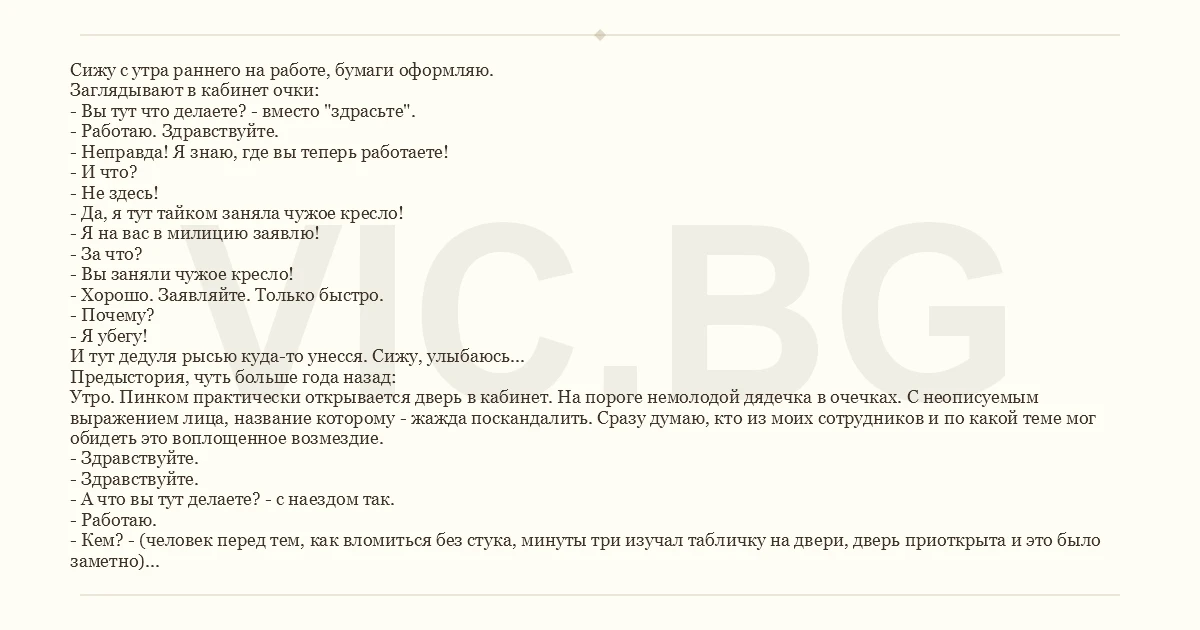 Сижу с утра раннего на работе, бумаги оформляю. Заглядывают в кабинет очки: - Вы тут что делаете? - вместо "здрасьте". - Работаю. Здравствуйте. - Неправда! Я знаю, где вы теперь работаете! - И что? - Не здесь! - Да, я тут тайком заняла чужое кресло! - Я на вас в милицию заявлю! - За что? - Вы заняли чужое кресло! - Хорошо. Заявляйте. Только быстро. - Почему? - Я убегу! И тут дедуля рысью куда-то унесся. Сижу, улыбаюсь... Предыстория, чуть больше года назад: Утро. Пинком практически открывается дверь в кабинет. На пороге немолодой дядечка в очечках. С неописуемым выражением лица, название которому - жажда поскандалить. Сразу думаю, кто из моих сотрудников и по какой теме мог обидеть это воплощенное возмездие. - Здравствуйте. - Здравствуйте. - А что вы тут делаете? - с наездом так. - Работаю. - Кем? - (человек перед тем, как вломиться без стука, минуты три изучал табличку на двери, дверь приоткрыта и это было заметно) - А вы сейчас разве не прочитали на двери? - А вдруг это не вы? - Это - я! Беру инициативу в свои руки: - Я могу вам чем-то помочь? - Нет! Скажите - где общество "Знание" сидит? - Дальше по коридору, после лестницы. - А кабинет какой? - Не знаю. С возмущением: - Как не знаете?!! - Вот так - не знаю :( - Вы плохой работник! - Почему? - Вы не знаете, где сидит общество "Знание"! - Я хороший работник! - Почему это?! - Я не знаю, где сидит общество "Знание". Значит, в рабочее время я сижу и работаю, а не гуляю по зданию. - Это неправильно! - Почему? Вы считаете, что в рабочее время работник должен изучать расположение кабинетов других структур? - Вы работаете в одном здании! - Правда? - Я буду на вас жаловаться! - За что? - Вы не знаете, где сидит общество "Знание"! - Хорошо. Кому жаловаться-то? - Вашему начальству! - А кто мое начальство? Дядечка впадает в ступор. Потом просыпается с прежней решительностью. - Я буду на вас жаловаться за то, что вы не знаете своего начальства! - Я знаю. - Но вы же у меня спрашивали! - Да. Вы собирались жаловаться моему начальству, и я уточняла, какому. Его много. - Почему вы мне этого не сказали? - Вы не спрашивали. - Я буду на вас жаловаться! - Кому? - Вашему начальству! - А почему не в милицию? - За что?! - Я не знаю, где сидит общество "Знание". - Я жалобу напишу! - Пишите. Бумага вот. - Вы мне на компьютере наберите! - Жалобу на меня? - Да!! - Не буду! - Почему? - Это не входит в мои служебные обязанности. И вот тут он меня сделал. По полной программе. - А по дружбе?