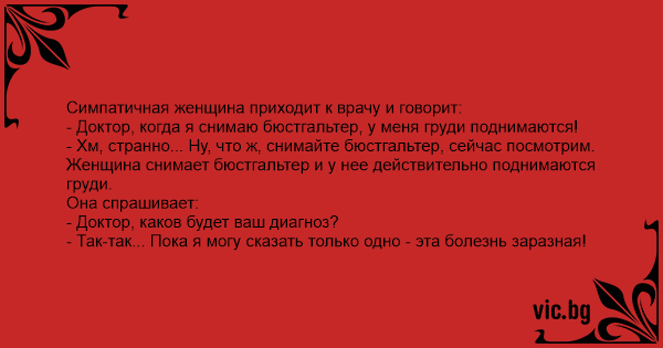 Млада жена отива на доктор: - Докторе, имам някаква странна болест, като си сваля сутиена и гърдите ми щръкват нагоре. - Дааа - наистина много странно, трябва да видя! Жената свалила сутиена и...