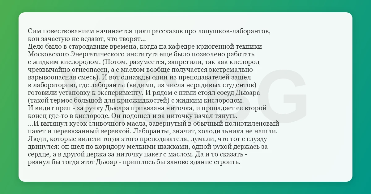 Сим повествованием начинается цикл рассказов про лопушков-лаборантов, кои зачастую не ведают, что творят... Дело было в стародавние времена, когда на кафедре криогенной техники Московского Энергетического института еще было позволено работать с жидким кислородом. (Потом, разумеется, запретили, так как кислород чрезвычайно огнеопасен, а с маслом вообще получается экстремально взрывоопасная смесь). И вот однажды один из преподавателей зашел в лабораторию, где лаборанты (видимо, из числа нерадивых студентов) готовили установку к эксперименту. И рядом с ними стоял сосуд Дьюара (такой термос большой для криожидкостей) с жидким кислородом. И видит преп - за ручку Дьюара привязана ниточка, и пропадает ее второй конец где-то в кислороде. Он подошел и за ниточку начал тянуть. ...И вытянул кусок сливочного масла, завернутый в обычный полиэтиленовый пакет и перевязанный веревкой. Лаборанты, значит, холодильника не нашли. Люди, которые видели тогда этого преподавателя, думали, что тот с глузду двинулся: он шел по коридору мелкими шажками, одной рукой держась за сердце, а в другой держа за ниточку пакет с маслом. Да и то сказать - рванул бы тогда этот Дьюар - пришлось бы заново здание строить.