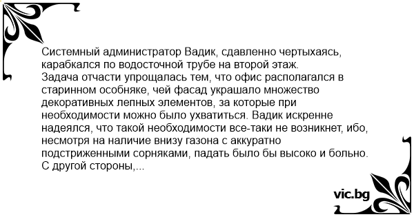 Задача отчасти упрощалась тем, что офис располагался в старинном особняке, чей фасад украшало множество декоративных лепных элементов, за которые при необходимости можно было ухватиться. Вадик искренне надеялся, что такой необходимости все-таки не возникнет, ибо, несмотря на наличие внизу газона с аккуратно подстриженными сорняками, падать было бы высоко и больно. С другой стороны, определенную сложность процессу добавлял еще и тот факт, что размеренная сисадминская работа не располагала к совершенствованию акробатических навыков. Она располагала к философскому миросозерцанию под пиво с чипсами, и сама по себе стимулировала бурный рост исключительно пуза, но никак не мускулатуры плечевого пояса. Однако Вадик с упорством альпиниста-спасателя лез вверх — там, в приветливо распахнутом окне, его уже терпеливо дожидался заветный приз в лице главного бухгалтера фирмы — Валентины Александровны.