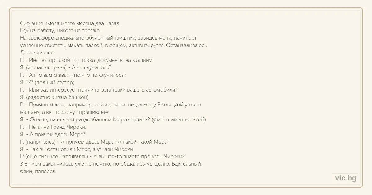 Ситуация имела место месяца два назад. Еду на работу, никого не трогаю. На светофоре специально обученный гаишник, завидев меня, начинает усиленно свистеть, махать палкой, в общем, активизирутся. Останавливаюсь. Далее диалог: Г: - Инспектор такой-то, права, документы на машину. Я: (доставая права) - А че случилось? Г: - А кто вам сказал, что что-то случилось? Я: ??? (полный ступор) Г: - Или вас интересует причина остановки вашего автомобиля? Я: (радостно киваю башкой) Г: - Причин много, например, ночью, эдесь недалеко, у Ветлицкой угнали машину, а вы причину спрашиваете. Я: - Она че, на старом раздолбанном Мерсе ездила? (у меня именно такой) Г: - Не-а, на Гранд Чироки. Я: - А причем здесь Мерс? Г: (напрягаясь) - А причем здесь Мерс? А какой-такой Мерс? Я: - Так вы остановили Мерс, а угнали Чироки. Г: (еще сильнее напрягаясь) - А вы что-то знаете про угон Чироки? З.Ы. Чем закончилось уже не помню, но общались мы долго. Бдительный, блин, попался.