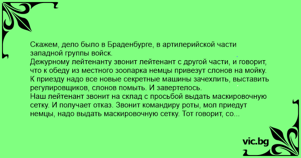Наш лейтенант звонит на склад с просьбой выдать маскировочную сетку. И получает отказ. Звонит командиру роты, мол приедут немцы, надо выдать маскировочную сетку. Тот говорит, со складом разберусь, получайте.
