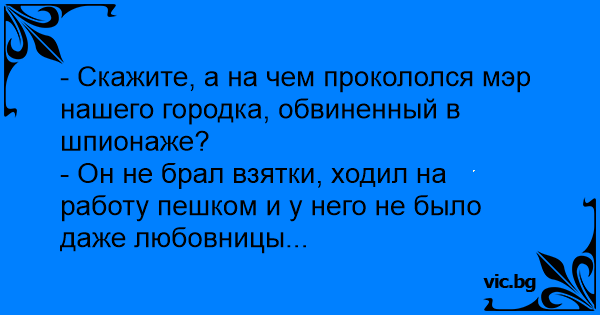 - Скажите, а на чем прокололся мэр нашего городка, обвиненный в шпионаже?