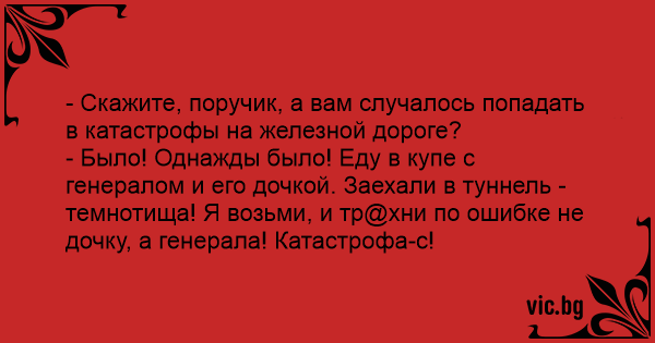 - Скажите, поручик, а вам случалось попадать в катастрофы на железной дороге?<br />- Было! Однажды было! Еду в купе с генералом и его дочкой. Заехали в туннель - темнотища! Я возьми, и тр@хни по ошибке не дочку, а генерала! Катастрофа-с!