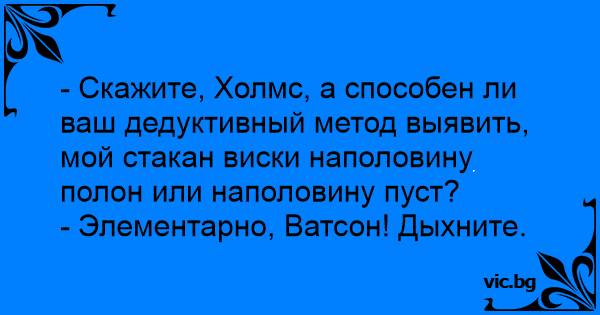 - Скажите, Холмс, а способен ли ваш дедуктивный метод выявить, мой стакан виски наполовину полон или наполовину пуст?