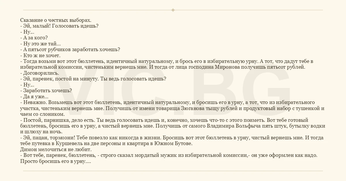- Постой, парнишка, дело есть. Ты ведь голосовать идешь и, конечно, хочешь что-то с этого поиметь. Вот тебе готовый бюллетень, бросишь его в урну, а чистый вернешь мне. Получишь от самого Владимира Вольфыча пять штук, бутылку водки и шлюху на ночь.