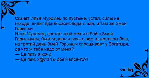 Скачет Илья Муромец по пустыне, устал, силы на исходе, видит вдали оазис вода и еда, и там же Змей Горыныч.