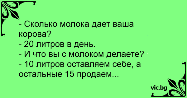 Съседе, по колко мляко доиш от твоята крава на ден? - Колко мляко дава вашата крава? Przyszli roz z powiotu tacy panowie i pytają gospodarza, wiela mu krowa dziennie mleka daje? - A będzie z 7 litrów! - A co z tym robicie? - 3 litry w doma zostają a 7 sprzedowomy spółdzielni.
