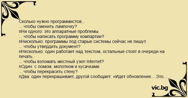Сколько нужно программистов... ... чтобы сменить лампочку? nНи одного: это аппаратные проблемы. ... чтобы написать программу компартии? nНисколько: программы под старые системы сейчас не пишут. ... чтобы утвердить документ? nНесколько: один работает над текстом, остальные стоят в очереди на печать. ... чтобы взломать местный узел Internet? nОдин: с ломом, молотком и кусачками. ... чтобы перекрасить стену? nДва: один перекрашивает, другой сообщает: «Идет обновление... Это может занять несколько минут... » ... чтобы деинсталлировать Windows 95? nТри: один хвалит, другой критикует, третий форматирует винчестер. ... чтобы удивить шефа? nНи одного: всем одновременно прогулять работу. ... чтобы создать многозадачную систему? nМного: по количеству задач. ... чтобы набрать 1024 Гб памяти? n2048: каждый со своим винчестером. ... чтобы разобраться в чужой программе? nПять: один учит язык, другой изучает текст, третий синхронизирует работу двух первых, четвертый ищет автора, пятый пишет все заново. ... чтобы компьютеры, наконец, нормально работали? nСемь: но ни одного не подпускать к компьютерам. ... чтобы помочь ближнему? n0,001: даже глубоко занятый отладкой программист может мимоходом нажать <F1>. ... чтобы спасти мир? nВсе: бросить программировать. ... чтобы переплюнуть хакеров? nПроизвольное количество: лишь бы ростом были выше хакеров. ... чтобы объясниться в любви? nОдин: и с ним 16,7 млн. цветов.