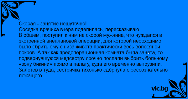 В общем, поступил к ним на скорой мужчина, что нуждался в экстренной внеплановой операции, для которой необходимо было сбрить ему с низа живота практически весь волосяной покров. А так как предоперационная комната была занята, то подвернувшуюся медсестру срочно послали выбрить больному «зону бикини» прямо в палату, куда его временно выгрузили.