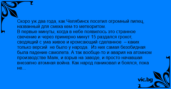 Скоро уж два года, как Челябинск посетил огромный пипец, названный для смеха кем-то метеоритом.