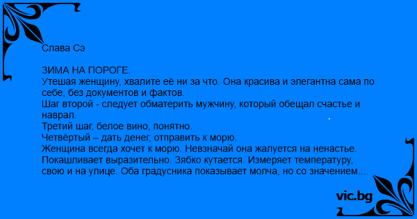 ЗИМА НА ПОРОГЕ. Утешая женщину, хвалите её ни за что. Она красива и элегантна сама по себе, без документов и фактов. Шаг второй - следует обматерить мужчину, который обещал счастье и наврал. Третий шаг, белое вино, понятно. Четвёртый – дать денег, отправить к морю. Женщина всегда хочет к морю. Невзначай она жалуется на ненастье. Покашливает выразительно. Зябко кутается. Измеряет температуру, свою и на улице. Оба градусника показывает молча, но со значением. Если же говорит прямо "я замёрзла, отвези меня в Канны", значит вы чурбан бесчувственный. Жара на даче женщине не подходит. Хороший климат начинается не ближе чем за тысячу километров от дома. Лишь где-то в Таиланде, ко всему прилипая, за минуту до теплового удара, женщина говорит заветное "как же здесь хорошо!" Я не люблю обобщений, поэтому возьмём конкретную мадам Попову. Её муж, месье Попов, в рамках улучшения отношений отправил жену на курорт. Через месяц получил письмо: "Вынуждена задержаться. Пришли ещё денег." И всё. Никаких "целую в бусю". Ни "твой хомячок", хотя бы. Холодная точка в конце. Похожая на дырочку от пули. Попов заподозрил неладное. Но на юг не поехал. Скакать куда-то, хлестать по щекам незнакомых цыган не позволила северная гордость. Теперь о том, как утешать Попова. Мужчины любят факты. Хвалить надо в конкретных цифрах. Слова "всего двенадцать литров на сотню!" лучше, чем "какие красивые у тебя глаза". Это странно, но свойства автомобиля/ружья/велосипеда мужчина приписывает себе. А за рост, лысину, талию и аппетит отвечает жена. "Сам-то я не толстый, просто она меня раскормила", - объясняет мужчина историю сплющенного мопеда. Ещё раз, качества железяк – заслуга мужчины. А толстожопие и косоглазие суть проделки жены. Так что хвалите его фрезерный станок. Второй шаг, напитки. Тут понятно, на сухую о любви не поговоришь. Третий шаг – следует похвалить женщину, которая сделала человека несчастным, как и обещала в ЗАГСе. Нужно сказать – "твоя грымза потрясающая женщина, всё-таки!". Объясню: быть брошенным потрясающей женщиной почётно. Называя же беглянку глупой курицей вы намыливаете другу петлю. Запомнили? Бабу – хвалим! Четвёртый шаг: никуда не едем, пьём на месте. Составив себе этот психологический конспект, я отправился утешать Попова. Дело было прошлой зимой, в холода. Попов живёт в Кокорякино, в доме с привидениями. Некая бабка померла, теперь перекладывает с места на место инструменты Попова. Всё приходится искать, особенно носки. На дальнейший рассказ бабка не влияет, хоть и участвует. Попов признал вину. Он не смог объяснить жене красоту холодного климата. Прорубь после бани, мороженое в январе. А голоногие пpoctиtуtkи на морозе! А выносить мусор в трусах сквозь снежный буран? Где ещё такое возможно? Сам Попов всегда готов отморозить руку, выкашлять лёгкое или схлопотать ангину, хотя бы. Он рад вернуться домой, звеня остекленевшими ушами. Настоящий патриот. Я возразил: женщинам, особенно красивым, французская жара нравится, а наше не нравится вообще всё. Этот гендерный диморфизм надо принять и смириться. Расхвалив таким образом жену Попова, я перешёл к возвеличиванию устройств, входящих в личность самого Попова. Расскажи, говорю, про свою замечательную печь! Можно ли с ней пережить оледенение? Попов описал устройство печи. Кратко, без индийских танцев, но с ожогами и прищемлением паль