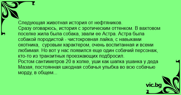 Следующая животная история от нефтяников. Сразу оговарюсь, история с эротическим оттенком. В вахтовом поселке жила была собака, звали ее Астра. Астра была собакой породистой - чистокровная лайка, с навыками охотника, суровым характером, очень воспитанная и всеми любимая. Но вот у нас появился еще один собачий персонаж, кто-то из транзитных проезжающих подбросил. Ростом сантиметров 20 в холке, уши как шапка ушанка у деда Мазая, постоянная шкодная собачья улыбка во всю собачью морду, в общем так выглядят герои американских мультфильмов. Кличку он получил редкую - Шарик, в простонародье Шар. За свой колоритный вид и добродушность Шар был пущен в святая святых для собак, сушилку. Каждый, кто заходил в сушилку переодеваться, был просто обязан с ним поиграть и так сказать набраться хорошего настроения. Второе утро началось громкими криками слов русского рабочего фольклора и хорошим пинком по Шариковой заднице. Почувствовав себя полноценным царем сушилки, Шар собрал всю обувь и вынес ее к уличному туалету, где сложил одной жеванной слюнявой кучей. Понятно, что за такой политический просчет Шарик был низложен с царя сушилки и изгнан из занимаемого помещения. Но тут пришла весна! Шар воспылал, нет не так, взорвался любовными чувствами и ясно дело чувства эти обращены были к Астре. Приступил он к боевым действиям на любовном фронте прямо и без прелюдий. Но из-за разницы в росте....., в общем, Шар не доставал. После чего началось трехдневное цирковое представлнние. Шарик в прыжке хватал Астру за холку, влезал ей на спину как лихой кавалерист на кобылу, потом, двигаясь по Астриной спине задним ходом, пытался воссоединица в момент падения. Прыгал сзади на одной лапе на цыпочках, и еще много чего из собачей камасутры. Когда Астре это надоедало, она гавкала и била Шарику в лоб лапой. На некоторое время это охлаждало любовный пыл Шарика, потом все начиналось заново. Народ, регулярно все это наблюдая, откровенно болел за Шарика, давал ему советы и обсуждал тактику, в общем мужская так сказать солидарность. На третий день свершилось, Шар передними лапами схватил Астру в области малого таза и на задних лапах потащил её назад, сам поднимаясь на ступеньки. Так Шариковая смекалка позволила завершить природный процесс, и надо было видеть выражение морды в этот момент.