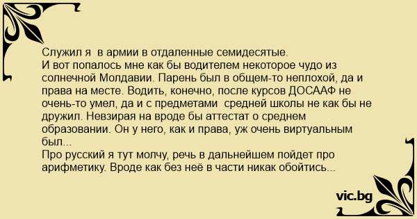 И вот попалось мне как бы водителем некоторое чудо из солнечной Молдавии. Парень был в общем-то неплохой, да и права на месте. Водить, конечно, после курсов ДОСААФ не очень-то умел, да и с предметами средней школы не как бы не дружил. Невзирая на вроде бы аттестат о среднем образовании. Он у него, как и права, уж очень виртуальным был...