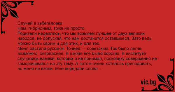 Родители надеялись, что мы возьмём лучшее от двух великих народов, не допуская, что нам достанется оставшееся. Зато ведь можно быть своим и для этих, и для тех.