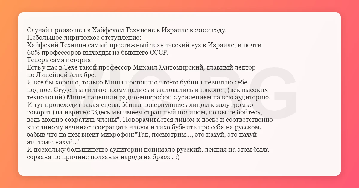 Случай произошел в Хайфском Технионе в Израиле в 2002 году. Небольшое лирическое отступление: Хайфский Технион самый престижный технический вуз в Израиле, и почти 60% профессоров выходцы из бывшего СССР. Теперь сама история: Есть у нас в Техе такой профессор Михаил Житомирский, главный лектор по Линейной Алгебре. И все бы хорошо, только Миша постоянно что-то бубнил невнятно себе под нос. Студенты сильно возмущались и жаловались и наконец (век высоких технологий) Мише нацепили радио-микрофон с усилением на всю аудиторию. И тут происходит такая сцена: Миша повернувшись лицом к залу громко говорит (на иврите):"Здесь мы имеем страшный полином, но вы не бойтесь, ведь можно сократить члены". Поворачивается лицом к доске и соответственно к полиному начинает сокращать члены и тихо бубнить про себя на русском, забыв что на нем висит микрофон:"Так, посмотрим..., это нахуй, это нахуй это тоже нахуй..." И поскольку большинство аудитории понимало русский, лекция на этом была сорвана по причине ползанья народа на брюхе. :)