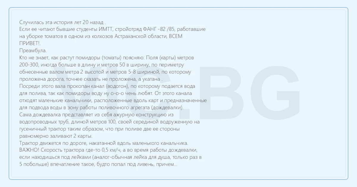 Случилась эта история лет 20 назад . Если ее читают бывшие студенты ИМТТ, стройотряд ФАНГ -82 /85, работавшие на уборке томатов в одном из колхозов Астраханской области, ВСЕМ ПРИВЕТ!. Преамбула. Кто не знает, как растут помидоры (томаты) поясняю: Поля (карты) метров 200-300, иногда больше в длину и метров 50 в ширину, по периметру обнесенные валом метра 2 высотой и метров 5-8 шириной, по которому проложена дорога, точнее сказать не проложена, а укатана . Посреди этого вала прокопан канал (водогон), по которому подается вода для полива, так как помидоры воду ну о-о-о чень любят. От этого канала отходят маленькие канальчики, расположенные вдоль карт и предназначенные для подвода воды в зону работы поливочного агрегата (дождевалки). Сама дождевалка представляет из себя ажурную конструкцию из водопроводных труб, длиной метров 100, своей серединой водруженную на гусеничный трактор таким образом, что при поливе две ее стороны равномерно заливают 2 карты. Трактор движется по дороге, накатанной вдоль маленького канальчика. ВАЖНО! Скорость трактора где-то 0,5 км/ч, а во время работы дождевалки, если находишься под лейками (аналог-обычная лейка для душа, только раз в 5 побольше) впечатление такое, будто попал под ливень, причем тропический. Полив идет до тех пор, пока человек, зайдя на залитый участок не провалится примерно по колено. Угораздило меня в то славное время жить и работать в вышеозначенном колхозе. И работал я как раз на той самой дождевалке прицепщиком. Почему причепщиком-не знаю до сих пор, так как за все время работы прицеплять ничего не довелось. Входило в мои обязанности следить за уровнем воды в водогоне, открывая или закрывая задвижку, следить за тем чтобы при перегоне трактора с карты на карту не грохнуть кого-нибудь или чего-нибудь дождевалкой, так как размах крыльев то ого-го, помогать трактористу при ремонте, и доставлять его домой при получении «производственной травмы», т. е укушавшегося в никуда и спать, спать, спать... И работал у нас агрономом один чел, Дима, очень любивший огненную воду. Как специалисту, чья работа сопряжена с постоянными разъездами, ему по штату полагался могучий хохлоджип -«ЛУАЗ». Амбула. Заканчиваем мы однажды работу, дело к вечеру, остался один проход. Видим, по центральному валу несется Димин хохлоджип, причем на хорошей скорости, выписывая кренделя. Не снижая скорости и едва не перевернувшись съезжает на дорогу, по которой ходит трактор, а так как дорога этим самым трактором уже занята, Дима трактор ОБЪЕЗЖАЕТ ПО ЗАЛИТОЙ КАРТЕ. Просочившись под "крылом самолета", хохлоджип по инерции пролетает еще метров 8 и впендюривается по самые дверки. Дима не замечает такой "мелочи" и продолжает газовать, причем из-за грохота тракторного дизеля шума мотора хохлоджипа не слышно, но летящая из-под колес грязь дает понять что Дима "едет" Трактору, чтобы пройти эти 8 метров, нужно примерно минут 15. Медленно "настигаем" Диму. Стена воды накрывает машину. На машине включаются "дворники" и звуковой сигнал. Медленно проезжаем мимо и метров через 5 перестаем даже оборачиваться, так как видели не раз как это чудо хохловской сборки своим ходом выбиралось из такой же грязи. НО! Дима при этом ДОЛЖЕН БЫТЬ КАК СТЕКЛЫШКО. Короче говоря, закончили работу минут через 40, заглушили трактор и пошли на полевой стан, откуда всех нас, человек 15 забирала машина 
