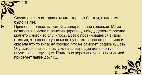 Пришел он однажды домой с поцарапанной коленкой. Мама возилась на кухне и заметив царапину, между делом спросила, мол что с ногой то случилось. Брат с провинившемся видом ответил, что на него упал кран. ну естественно не поверила и сказала что то типа: ну хорошо, что не самолет, садись кушать.