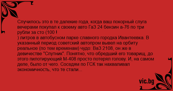 Случилось это в те далекие года, когда ваш покорный слуга вечерами покупал к своему авто ГаЗ 24 бензин а-76 по три рубли за сто (100 !