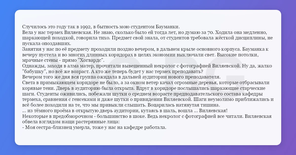 Случилось это году так в 1992, в бытность мою студентом Бауманки. Вела у нас термех Виляевская. Не знаю, сколько было ей тогда лет, но думаю за 70. Ходила она медленно, шаркающей походкой, говорила тихо. Предмет свой знала, от студентов требовала жёсткой дисциплины, не пускала опоздавших. Занятия у нас по её предмету проходили поздно вечером, в дальнем крыле основного корпуса. Бауманка к вечеру пустела и во многих длинных коридорах в целях экономии выключали свет. Высокие потолки, мрачные стены - прямо "Хогвардс". Однажды, заходя в алма матер, прочитали вывешенный некролог с фотографией Виляевской. Ну да, жалко "бабушку", но всё же возраст. А кто же теперь будет у нас термех преподавать? Вечером того же дня вся группа ожидала в дальней аудитории нового преподавателя. Света в примыкающем коридоре не было, а за окном ветер качал огромные деревья, которые отбрасывали корявые тени. Дверь в аудиторию была открыта. Вдруг в коридоре послышались шаркающие старческие шаги. Студенты оживились, побежали шутки о среднем возрасте предподавательского состава кафедры термеха, сравнения с генсеками и даже шутки о привидении Виляевской. Шаги неумолимо приближались и всё более походили на те, что мы привыкли слышать. Воцарилась натянутая тишина. ... из тёмного проёма в открытую дверь аудитории, кутаясь в шаль, вошла ... Виляевская! Некоторые в предобморочном - большинство в шоке. Ведь некролог с фотографией все читали. Виляевская обвела взглядом нащи растерянные лица: - Моя сестра-близнец умерла, тоже у нас на кафедре работала.