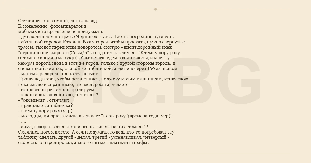 Случилось это со мной, лет 10 назад. К сожалению, фотоаппаратов в мобилах в то время еще не придумали. Еду с водителем по трассе Чернигов - Киев. Где-то посредине пути есть небольшой городок Козелец. В сам город, чтобы проехать, нужно свернуть с трассы, так вот перед этим поворотом, смотрю - висит дорожный знак "ограничение скорости 70 км/ч", а под ним табличка - "В темну пору року (в темное время года (укр)). Улыбнулся, едем с водителем дальше. Тут как-раз дорога снова в этот же город, только с другой стороны города, и снова такой же знак, с такой же табличкой, а метров через 100 за знаком - менты с радаром - на посту, значит. Прошу водителя, чтобы остановился, подхожу к этим гаишникам, ксиву свою показываю и спрашиваю, что мол, ребята, делаете. - скоростной режим контролируем - какой знак, спрашиваю, там стоит? - "семьдесят", отвечают - правильно, а табличка? - в темну пору року (укр) - молодцы, говорю, а какие вы знаете "поры року"(времена года -укр)? - .... - зима, говорю, весна, лето и осень - какая из них "темная"? Смеялись потом вместе. А если подумать, то ведь кто-то потребовал эту табличку сделать, другой - делал, третий - устанавливал, четвертый - скорость контролировал, а много пятых - платили штрафы.