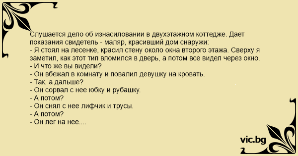 Слушается дело об изнасиловании в двухэтажном коттедже. Дает показания свидетель - маляр, красивший дом снаружи: