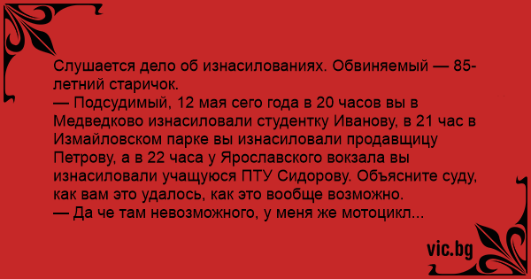— Подсудимый, 12 мая сего года в 20 часов вы в Медведково изнасиловали студентку Иванову, в 21 час в Измайловском парке вы изнасиловали продавщицу Петрову, а в 22 часа у Ярославского вокзала вы изнасиловали учащуюся ПТУ Сидорову. Объясните суду, как вам это удалось, как это вообще возможно.