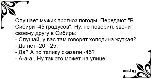 Слушает мужик прогноз погоды. Передают "В Сибири -45 градусов". Ну, не поверил, звонит своему другу в Сибирь: