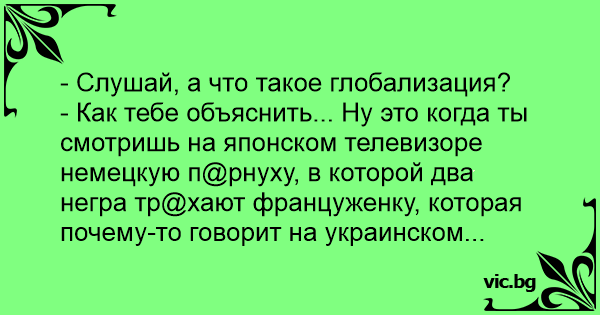 - Как тебе объяснить... Ну это когда ты смотришь на японском телевизоре немецкую п@рнуху, в которой два негра тр@хают француженку, которая почему-то говорит на украинском...