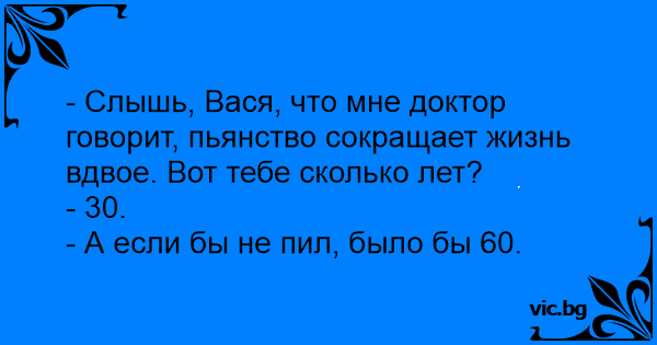 - Слышь, Вася, что мне доктор говорит, пьянство сокращает жизнь вдвое. Вот тебе сколько лет?