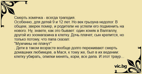 Особенно, для детей 9 и 12 лет. Но век грызуна недолог. В общем, зверек помер, и родители не успели его подменить на нового. Ну, знаете, как это бывает: один хомяк в Валгаллу, другой из зоомагазина в клетку. Дочь плачет, сын крепится, но только потому, что папа сказал:
