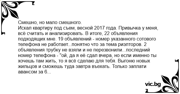 Искал квартиру под съем, весной 2017 года. Привычка у меня, всё считать и анализировать. В итоге, 22 объявления подходящих мне. 19 объявлений - номер указанного сотового телефона не работает...понятно что за тема риэлторов. 2 объявления трубку не взяли и не перезвонили...последний номер телефона - "ой, да я её сдал вчера, но если именно ты хочешь там жить, то я всё сделаю для тебя. Выгоню новых жильцов и сможешь туда завтра въехать. Только заплати авансом за 6 месяцев и я всё сделаю" я кое-как сдержался чтобы не засмеяться))) и спросил у мальчика, на какой зоне он сидит. Он бросил трубку. Я перепроверял, ровно через 10 минут, телефонный номер перестал работать))) в итоге, поминая свою старую службу Родине, данный номер я скинул милиции, операм и забыл об этом юном мудаке) через неделю звонок, не беру левые и неизвестные мне номера, но в этот раз взял. Звонил опер из соседнего города, моего субъекта РФ и рассказал- голос юнца был тонким потому что он наркоман, алкоголик и т.п. лет ему всего 20. Внимание, а эпизодов у него 33. Ведь 33 человека ему поверили))))) вот такая история была у меня(