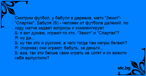Смотрим футбол, у бабули в деревне, матч "Зенит"- "Спартак". Бабуля (Б) - человек от футбола далекий, по ходу матча задает вопросы и комментирует.
