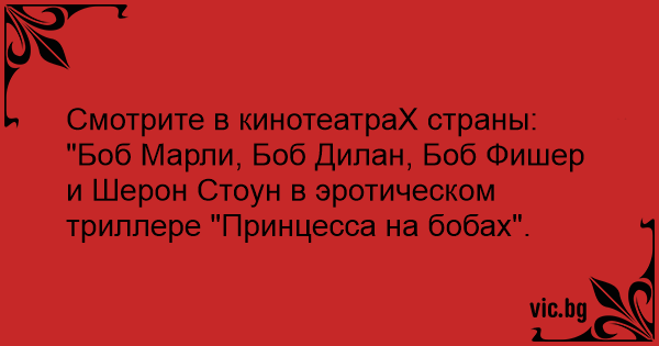 Смотрите в кинотеатpaX страны: "Боб Марли, Боб Дилан, Боб Фишер и Шерон Стоун в эротическом триллере "Принцесса на бобах".