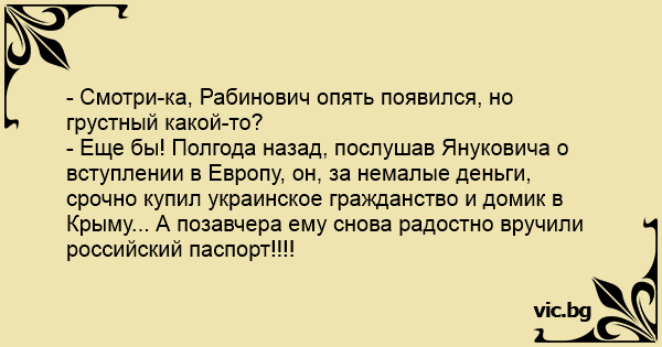 - Еще бы! Полгода назад, послушав Януковича о вступлении в Европу, он, за немалые деньги, срочно купил украинское гражданство и домик в Крыму... А позавчера ему снова радостно вручили российский паспорт!!!!
