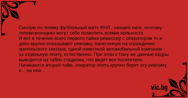 Смотрю по телику футбольный матч ФНЛ - низшей лиги, поэтому телевизионщики могут себе позволить всякие вольности. И вот в течение всего первого тайма режиссер с оператором то и дело крупно показывают рекламу, нанесенную на ограждение зрительского сектора, одной известной автомобильной компании - за отдельную плату, естественно. При этом к тому же данные кадры выводятся на табло стадиона, что видят все посетители. Начинается второй тайм, оператор опять крупно берет эту рекламу, и... на ней над названием фирмы отчетливо видны каракули - "Продаю гараж" и номер телефона. Кто-то из болельщиков правильно оценил ситуацию и в перерыве матча подсуетился, вывесив свое объявление, как говорится, за счет фирмы. Так это объявление и "провисело" до конца игры, а на ту рекламу все равно фокус наводили - зря, что ли, фирмачи бабки заплатили.