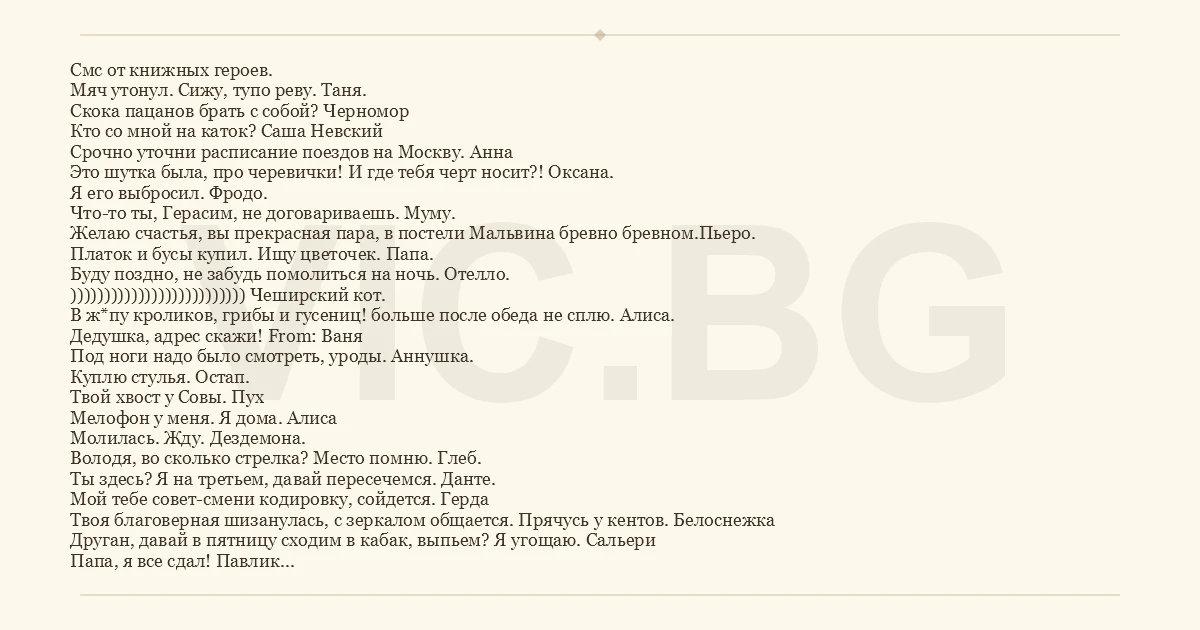 Смс от книжных героев. Мяч утонул. Сижу, тупо реву. Таня. Скока пацанов брать с собой? Черномор Кто со мной на каток? Саша Невский Срочно уточни расписание поездов на Москву. Анна Это шутка была, про черевички! И где тебя черт носит?! Оксана. Я его выбросил. Фродо. Что-то ты, Герасим, не договариваешь. Муму. Желаю счастья, вы прекрасная пара, в постели Мальвина бревно бревном.Пьеро. Платок и бусы купил. Ищу цветочек. Папа. Буду поздно, не забудь помолиться на ночь. Отелло. )))))))))))))))))))))))))) Чеширский кот. В ж*пу кроликов, грибы и гусениц! больше после обеда не сплю. Алиса. Дедушка, адрес скажи! From: Ваня Под ноги надо было смотреть, уроды. Аннушка. Куплю стулья. Остап. Твой хвост у Совы. Пух Мелофон у меня. Я дома. Алиса Молилась. Жду. Дездемона. Володя, во сколько стрелка? Место помню. Глеб. Ты здесь? Я на третьем, давай пересечемся. Данте. Мой тебе совет-смени кодировку, сойдется. Герда Твоя благоверная шизанулась, с зеркалом общается. Прячусь у кентов. Белоснежка Друган, давай в пятницу сходим в кабак, выпьем? Я угощаю. Сальери Папа, я все сдал! Павлик Половина двенадцатого! Герман, ты где? Пишу с английского номера. Подвески забрал, скоро буду. Д? Арт Дождись своего трамвая. Берлиоз. Дождусь. Макс Фрай. Пушкин, ты сам-то когда-нить изумруды грыз??? Белочка Земля. Санников Я быстро — одна нога здесь, другая там! А. Каренина Блин, когда же я высплюсь? Красавица. ДА! И я! Брут. Они все больные! Айболит А у Диснея я бы выжила, слышишь, Ганс! Русалочка Сны пронумеровала. Что дальше делать? Вера Павловна Вскрытие показало, что пациент переедал. Лесорубы Олег, смотри под ноги! Конь Достопочтимый сэр! Обстоятельства задерживают, нагоню на болотах. Ваша Собака.