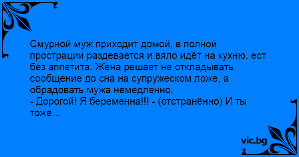 Смурной муж приходит домой, в полной прострации раздевается и вяло идёт на кухню, ест без аппетита. Жена решает не откладывать сообщение до сна на супружеском ложе, a обрадовать мужа немедленно.