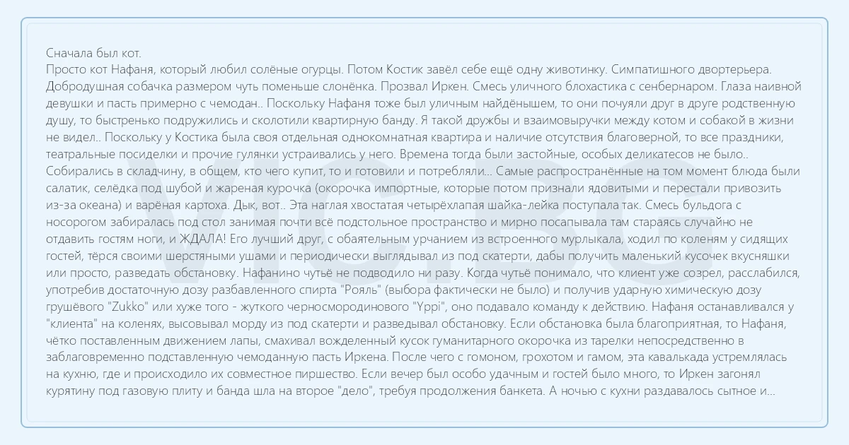 Просто кот Нафаня, который любил солёные огурцы. Потом Костик завёл себе ещё одну животинку. Симпатишного двортерьера. Добродушная собачка размером чуть поменьше слонёнка. Прозвал Иркен. Смесь уличного блохастика с сенбернаром. Глаза наивной девушки и пасть примерно с чемодан.. Поскольку Нафаня тоже был уличным найдёнышем, то они почуяли друг в друге родственную душу, то быстренько подружились и сколотили квартирную банду. Я такой дружбы и взаимовыручки между котом и собакой в жизни не видел.. Поскольку у Костика была своя отдельная однокомнатная квартира и наличие отсутствия благоверной, то все праздники, театральные посиделки и прочие гулянки устраивались у него. Времена тогда были застойные, особых деликатесов не было.. Собирались в складчину, в общем, кто чего купит, то и готовили и потребляли... Самые распространённые на том момент блюда были салатик, селёдка под шубой и жареная курочка (окорочка импортные, которые потом признали ядовитыми и перестали привозить из-за океана) и варёная картоха. Дык, вот.. Эта наглая хвостатая четырёхлапая шайка-лейка поступала так. Смесь бульдога с носорогом забиралась под стол занимая почти всё подстольное пространство и мирно посапывала там стараясь случайно не отдавить гостям ноги, и ЖДАЛА! Его лучший друг, с обаятельным урчанием из встроенного мурлыкала, ходил по коленям у сидящих гостей, тёрся своими шерстяными ушами и периодически выглядывал из под скатерти, дабы получить маленький кусочек вкусняшки или просто, разведать обстановку. Нафанино чутьё не подводило ни разу. Когда чутьё понимало, что клиент уже созрел, расслабился, употребив достаточную дозу разбавленного спирта "Рояль" (выбора фактически не было) и получив ударную химическую дозу грушёвого "Zukko" или хуже того - жуткого черносмородинового "Yppi", оно подавало команду к действию. Нафаня останавливался у "клиента" на коленях, высовывал морду из под скатерти и разведывал обстановку. Если обстановка была благоприятная, то Нафаня, чётко поставленным движением лапы, смахивал вожделенный кусок гуманитарного окорочка из тарелки непосредственно в заблаговременно подставленную чемоданную пасть Иркена. После чего с гомоном, грохотом и гамом, эта кавалькада устремлялась на кухню, где и происходило их совместное пиршество. Если вечер был особо удачным и гостей было много, то Иркен загонял курятину под газовую плиту и банда шла на второе "дело", требуя продолжения банкета. А ночью с кухни раздавалось сытное и радостное чавканье честных добытчиков.