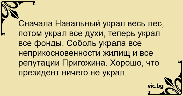 Сначала Навальный украл весь лес, потом украл все духи, теперь украл все фонды. Соболь украла все неприкосновенности жилищ и все репутации Пригожина. Хорошо, что президент ничего не украл.