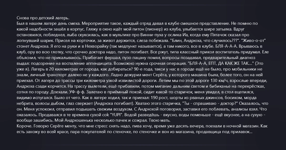 Снова про детский лагерь. Был в нашем лагере день смеха. Мероприятие такое, каждый отряд давал в клубе смешное представление. Не помню по какой надобности зашёл в корпус. Гляжу в окно идёт мой питон (пионер) из клуба, улыбается шире затылка. Вдруг остановился, побледнел, лыба скуксилась, как в мультике про Винни-пуха у ослика Иа, когда ему Пятачок сказал про лопнувший шарик. Присел на корточки, за живот держится, слеза побежала. "Блин, Андрюха, что случилось???". "Живо-о-от" стонет Андрюха. Я его на руки и в Нехворайку (так медпункт называется), а там никого, все в клубе. БЛЯ-А-А-А. Врываюсь в клуб, ору во всю глотку, что срочно доктора надо, питон погибает. Все ржут, типа классный прикол воспитатель придумал. Еле объяснил, что не прикалываюсь. Прибегает фершал, пузо пацану помял, вопросы позадавал, предварительный диагноз выдал: подозрение на воспаление аппендицита. Возможно нужна срочная операция. "БЛЯ-А-А, ЕПТ, ДА КАК ЖЕ ТАК...." (Это уже я). Лагерь в 20 километрах от города, как добираться? 90-е года, такси у нас в городе ещё не было, про мобильники не знали, личный транспорт далеко не у каждого. Ладно дежурил мент Серёга, у которого машина была, более того, он на ней приехал. От лагеря до трассы три километра узкой извилистой дороги. Летим мы по этой дороге 130 км/ч, взрослые впереди, Андрюха сзади корчится. На трассу вылетели, ещё прибавили, потом мигание дальним светом и бибиканье на перекрёстках, сотня по городу. Доехали. УФ-ф-ф. Залетаю в приёмный покой, сидит какой-то старичок, меня увидел, в стол вцепился, видимо испугался. Было от чего. Как в лагере ходил, так и приехал: 190 рост, шорты из рваных джинсов, босиком, морда небрита, волосы дыбом, глаз сверкает (Андрюха погибает). Хватаю этого старичка, "Ты - спрашиваю - доктор?" Оказалось, что он. Меня успокоил, отправил подышать свежим воздухом. С Андрюхой поговорил, заставил его поблевать, анализы взял. Что оказалось. Продавался в те времена сухой cok "YUPI". Водой разведёшь - вкусно, воды поменьше - ещё вкуснее, а на сухую - вообще зашибись. Мой Андрюшенька несколько пачек и сожрал. Твою мать. Короче. Говорю Серёге менту, что мне стресс снять надо, пива хочу, время уже десять вечера, поехали в ночной магазин. Как есть захожу во всей красе, пара покупателей по стеночке, по стеночке и вон из магазина, продавщица под прилавок спряталась, охранник за дубинку хватается. Когда объяснил им, кто я, поржали вместе. Купил пива, выхожу, смотрю, а Андрюха на заднем сиденье лежит, глазки закатил, рот открыт, язык на сторону. Явно помирает. БЛЯ-А-А-А-А-А-А-А. "АНДРЮХА, что с тобой???". Этот маленький засранец голову поднял, на меня посмотрел: "А, чё, я сплю". ТВОЮ МАТЬ.